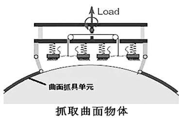 這種抓具分平面和曲面兩種單元,可依據(jù)物體形狀選擇。抓具單元表面覆有粘合墊,當(dāng)抓具沿特定方向施加壓力時,依靠粘合墊抓牢物體;壓力消失后,粘合墊與物體分離。實驗表明,一片相對較小的粘合墊可以抓住重達(dá)300公斤的物體。