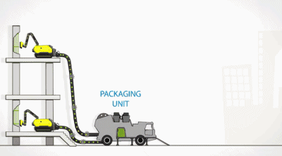 通過內(nèi)部的高壓水槍,對(duì)吸進(jìn)去的混合物進(jìn)行分離。這款水泥回收機(jī)器人還能將被分離后的砂石和水泥直接打包回收,轉(zhuǎn)變?yōu)樾碌慕ㄖ昧稀o需任何加工就可以實(shí)現(xiàn)建筑物材料的再利用。