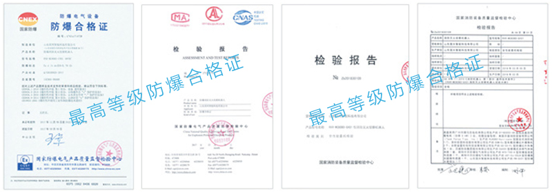 該系列整機(jī)產(chǎn)品獲得了國(guó)家防爆認(rèn)證中心的防爆合格證書(shū)。是國(guó)內(nèi)唯一的,最具權(quán)威、最高等級(jí)的防爆合格證書(shū)。其中的電機(jī)、云臺(tái)、氣體檢測(cè)、智能消防水炮等所有配件均通過(guò)國(guó)家防爆認(rèn)證,成為國(guó)內(nèi)真正通過(guò)防爆認(rèn)證的特種機(jī)器人,自主研發(fā)的防爆電池管理系統(tǒng)及軟件,大功率驅(qū)動(dòng)器、電機(jī)等產(chǎn)品使防爆級(jí)別遙遙領(lǐng)先國(guó)內(nèi)同類(lèi)產(chǎn)品,并全部獲得國(guó)家發(fā)明專利。國(guó)興智能始終把安全和生命放在產(chǎn)品的首位, 以人為本,臻于至善的精神貫穿防爆產(chǎn)品始終!