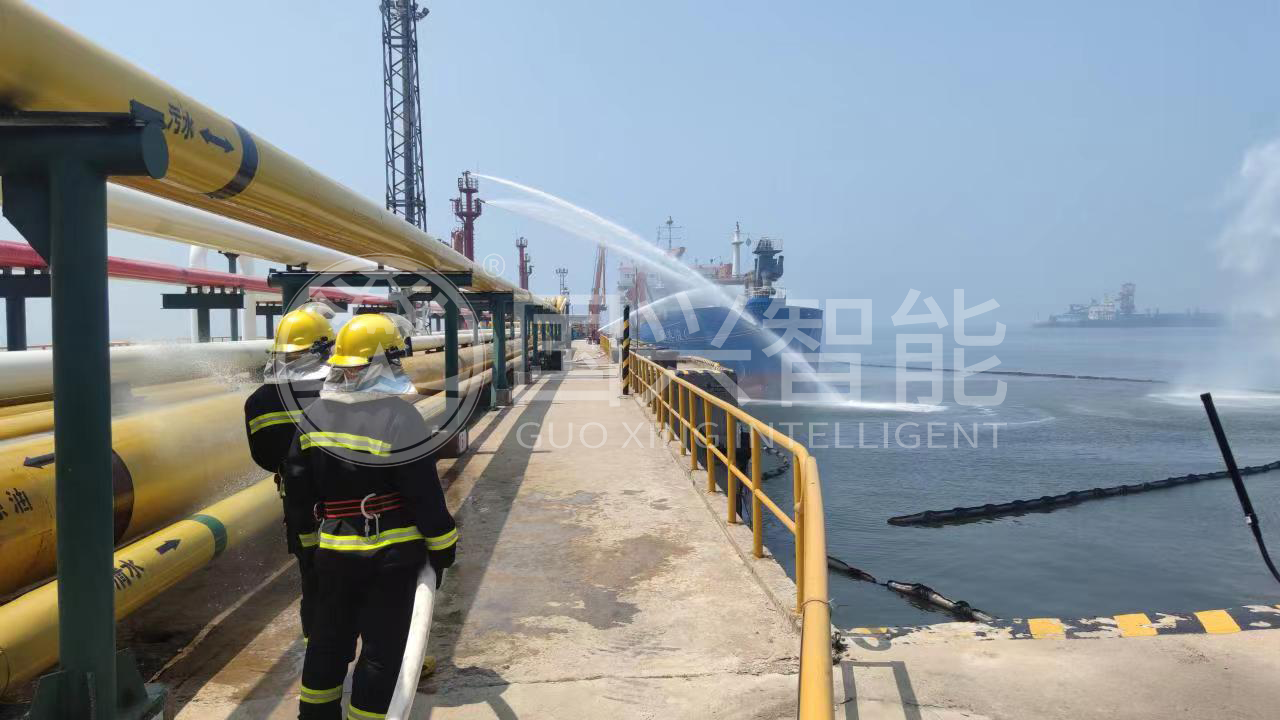 本次演練模擬7月4日下午14時(shí)30分,秦港一公司101#泊位船只在生產(chǎn)作業(yè)過(guò)程中,管線(xiàn)破裂發(fā)生原油泄漏,溢油至船岸,現(xiàn)場(chǎng)職工在巡檢中發(fā)現(xiàn)后,立即組織人員對(duì)漏油處進(jìn)行清理,作業(yè)過(guò)程中意外起火,一公司逐級(jí)啟動(dòng)應(yīng)急處置方案、應(yīng)急預(yù)案,實(shí)施初期滅火;在經(jīng)過(guò)初期撲救無(wú)效后,火勢(shì)擴(kuò)大,秦港股份公司綜合應(yīng)急預(yù)案啟動(dòng),在股份公司應(yīng)急指揮部協(xié)調(diào)下,秦皇島港企業(yè)消防救援隊(duì)、市消防救援支隊(duì)組織實(shí)施滅火。面對(duì)火災(zāi)現(xiàn)場(chǎng)復(fù)雜不明,國(guó)興智能自主研發(fā)的防爆消防滅火偵察機(jī)器人深入火場(chǎng)偵察火源,通過(guò)可見(jiàn)光巡視及紅外熱成像技術(shù)等,將現(xiàn)場(chǎng)畫(huà)面與環(huán)境參數(shù)實(shí)時(shí)回傳至控制中心,為救援力量部署提供輔助決策依據(jù)。