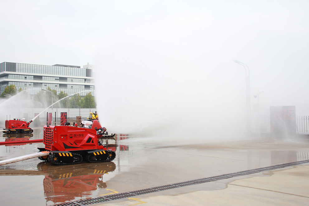 在活動現(xiàn)場,國興智能負(fù)責(zé)人向參會領(lǐng)導(dǎo)詳細(xì)介紹了公司在消防機(jī)器人領(lǐng)域產(chǎn)品創(chuàng)新、生產(chǎn)狀況、產(chǎn)品特點以及產(chǎn)品應(yīng)用場景多元化建設(shè)等。隨后,現(xiàn)場展示了四驅(qū)柴油滅火機(jī)器人爬坡越障、水炮打水等性能;舉升排煙消防機(jī)器人的排煙風(fēng)量、水炮打水、舉升高度等性能,通過動態(tài)演示,充分展示了產(chǎn)品的機(jī)動性強(qiáng)、水炮流量大射程遠(yuǎn)、通過性強(qiáng)等方面優(yōu)勢,也展現(xiàn)出國興智能在產(chǎn)品技術(shù)研發(fā)方面的優(yōu)勢。