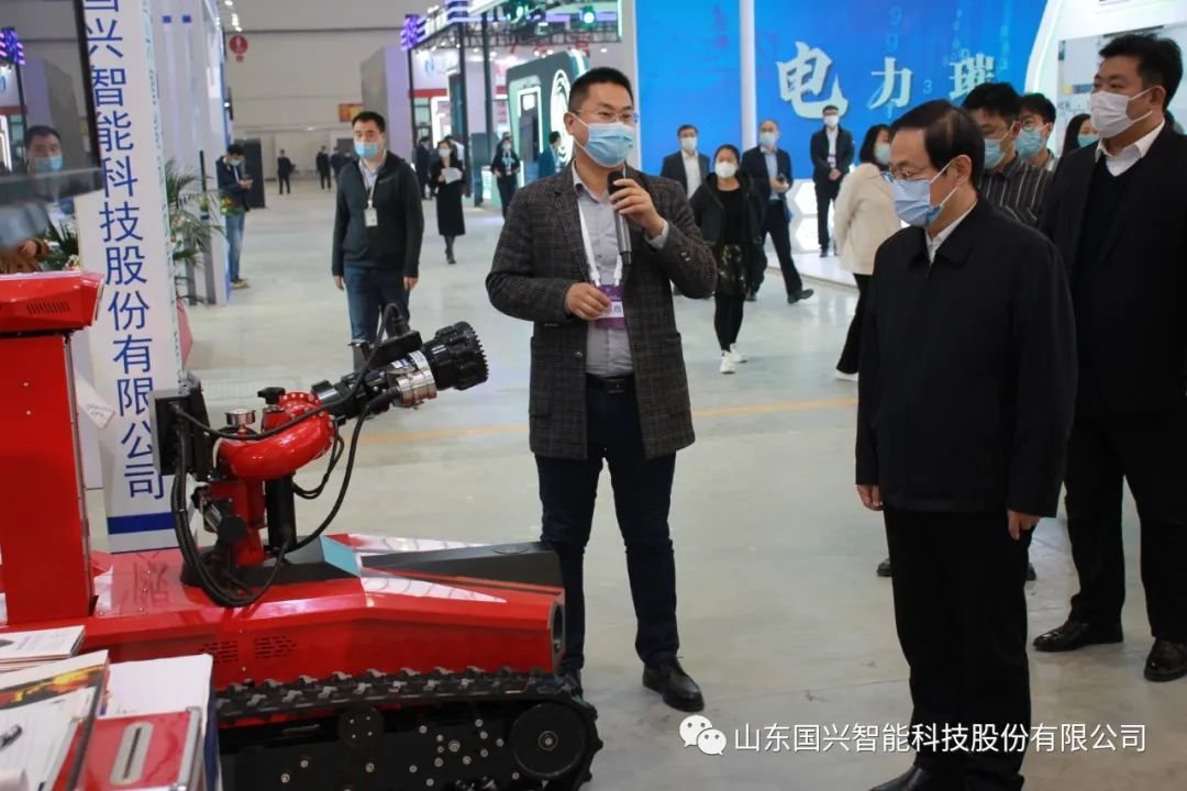 也正是因為國興智能不斷在智能化、數(shù)字化方向不斷前行,在活動期間,吸引了諸多領(lǐng)導來到展位前參觀。在8日當天,山東省工業(yè)和信息化廳黨組書記、廳長張海波來到國興智能展位前參觀指導,在聽完國興智能的企業(yè)介紹與產(chǎn)品介紹之后,對國興智能在消防機器人領(lǐng)域智能化、信息化、無人化方向發(fā)展給予肯定。