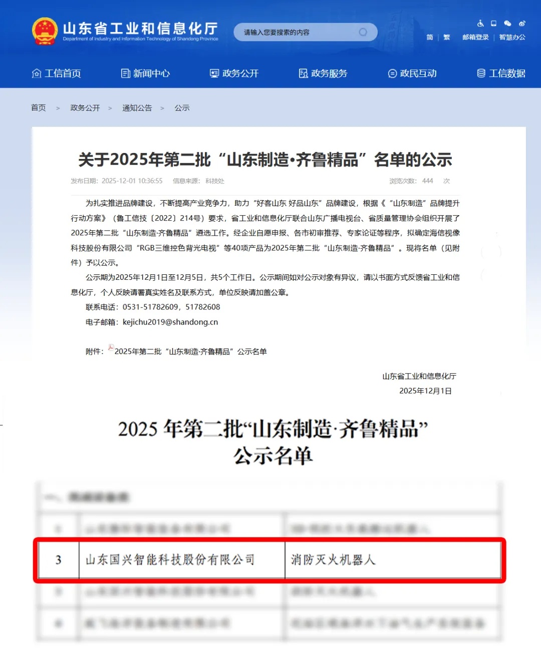 近日,山東工業(yè)和信息化部正式公示第二批“山東制造·齊魯精品”的企業(yè)名單,國興智能憑借“電動防爆四驅(qū)消防滅火機器人”以卓越創(chuàng)新科技成功入選!這一項新增榮譽,是社會各界對國興智能產(chǎn)品實力的認可,更是對國興智能扎實推進科技創(chuàng)新,打造智能化新質(zhì)生產(chǎn)力的肯定。